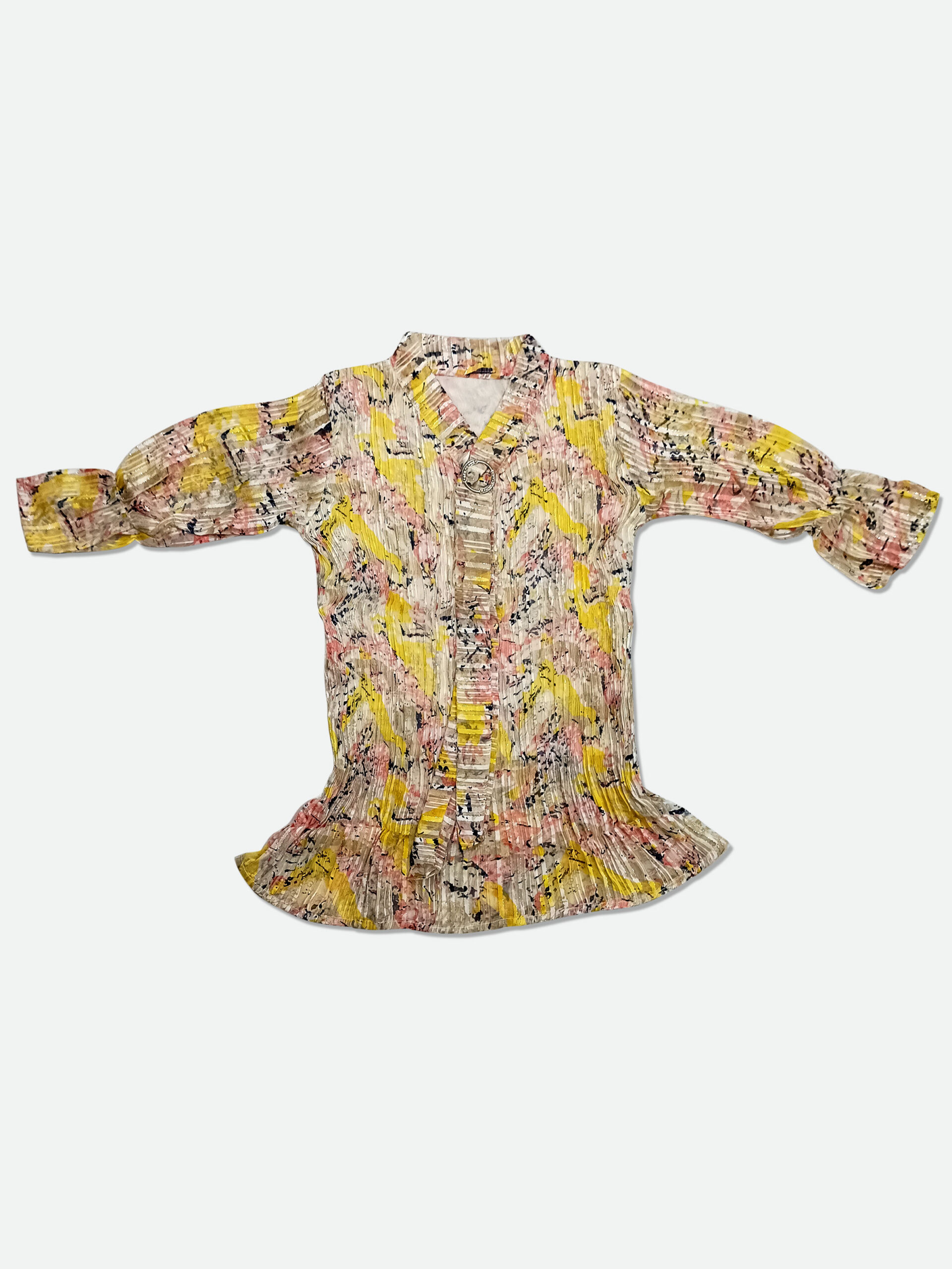 A chiffon top adorned with a vibrant yellow and pink color print is a quintessential wardrobe piece that perfectly embodies the essence of spring and summer fashion. Chiffon, known for its lightweight and airy texture, drapes elegantly over the body, providing both comfort and style. The fluid nature of the fabric allows for a graceful movement, making it an excellent choice for various occasions, from casual outings to more festive events.