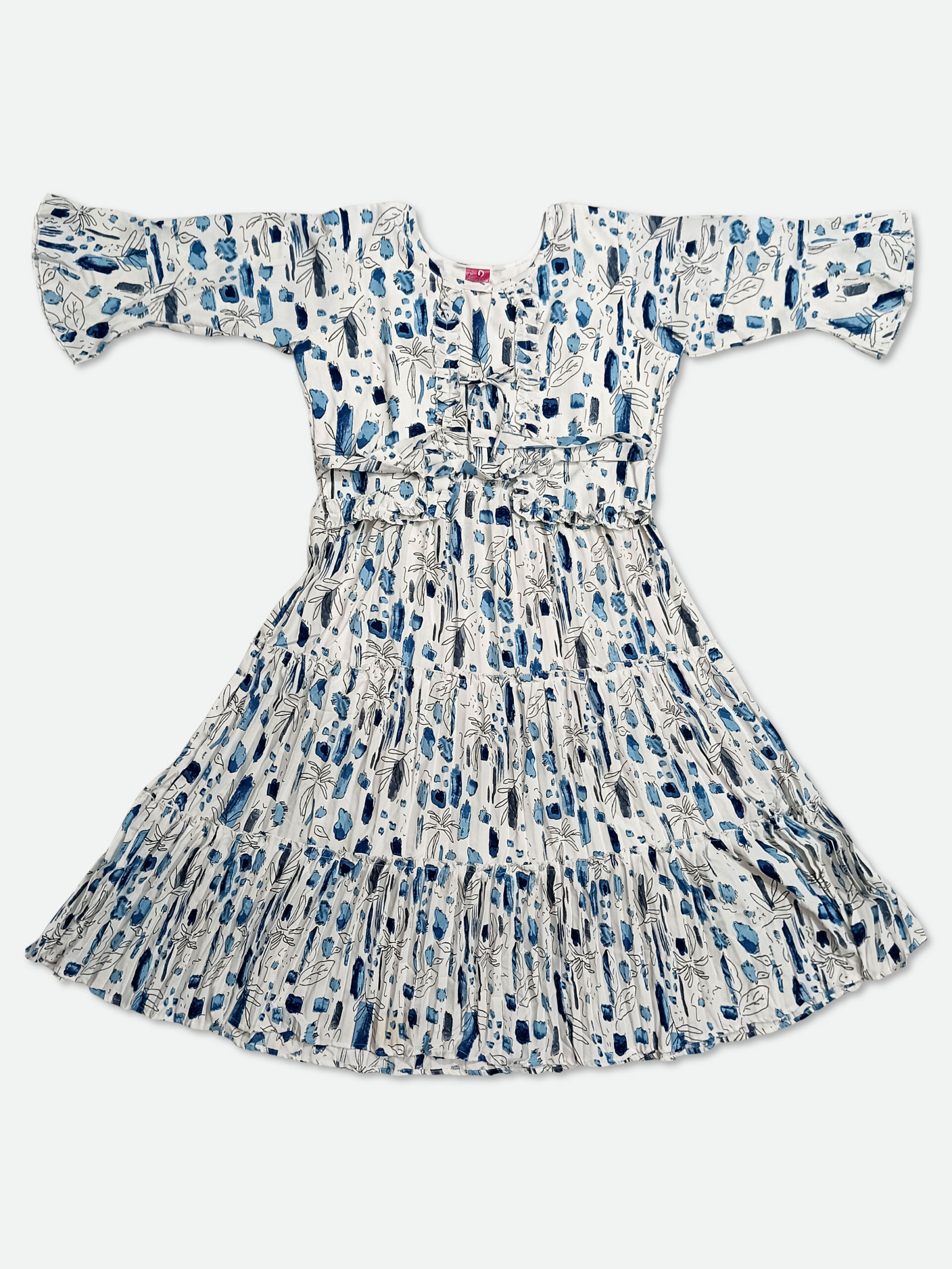Made from high-quality georgette fabric, this dress is lightweight and airy, providing a flattering drape that enhances the wearer’s figure. The soothing light blue color exudes tranquility, while the crisp white accents create a beautiful contrast, adding freshness and vibrancy to the overall look. The soft texture of the georgette ensures comfort, allowing for easy movement and all-day wear.